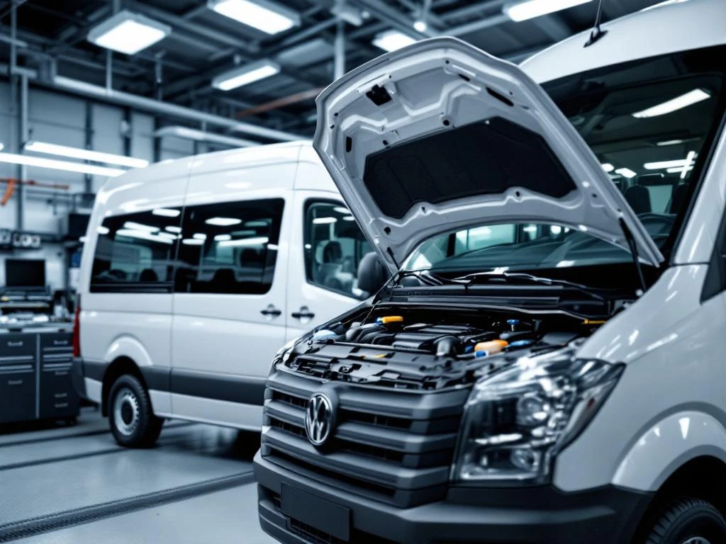 Witte Volkswagen Crafter personenbus met open motorkap tijdens professionele inspectie in autogarage