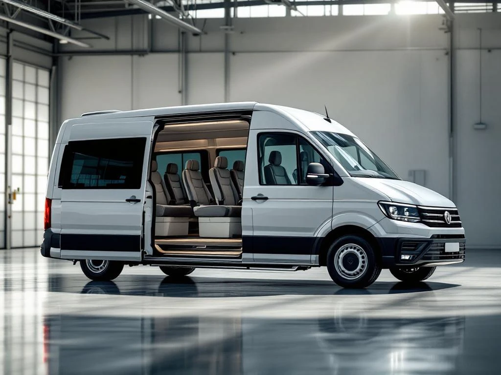 Witte Volkswagen 9-persoons busje met open zijdeur en Crafter minibus op moderne autofaciliteit bij daglicht
