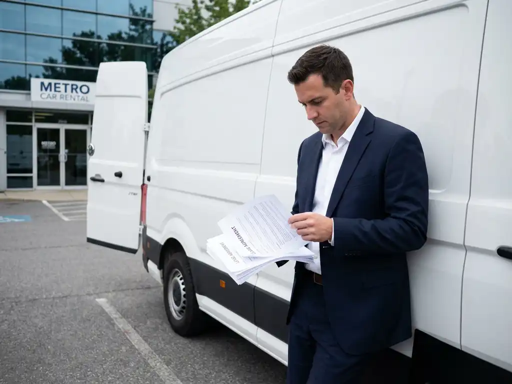 Zakenman in pak bekijkt leasecontract bij witte Volkswagen Crafter bestelwagen voor autoverhuurkantoor