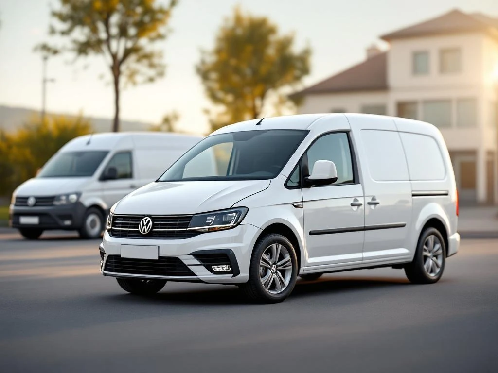 Witte Volkswagen Caddy bestelwagen op asfalt met andere VW bedrijfsvoertuigen op de achtergrond