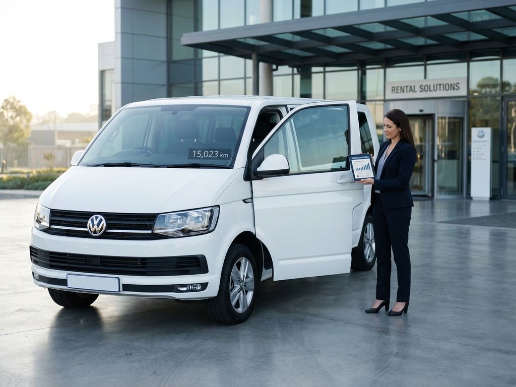 Witte Volkswagen 9-persoons bus bij autoverhuur met zakenvrouw die kilometerstand controleert op tablet
