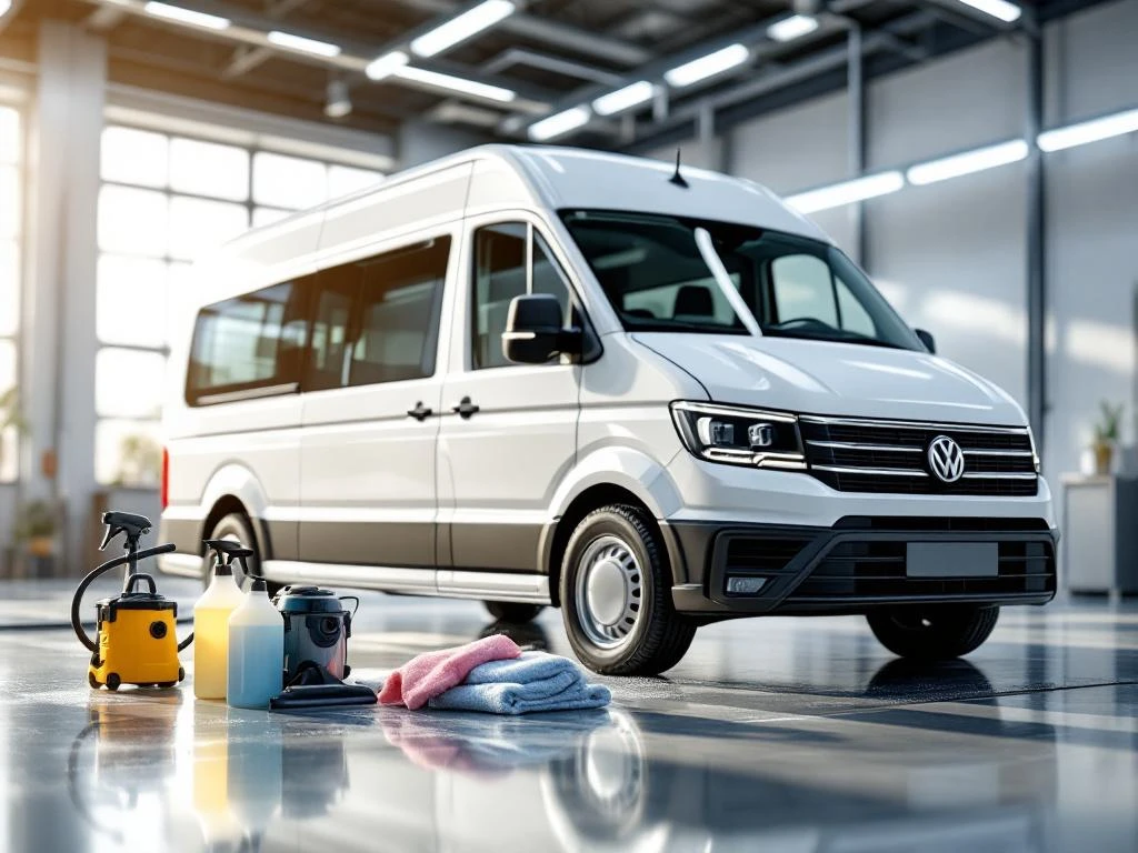 Witte Volkswagen Crafter personenbus in moderne autowasserij met professionele schoonmaakbenodigdheden op voorgrond