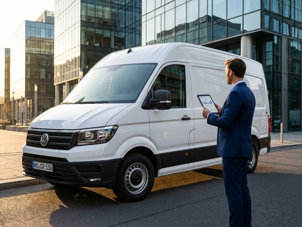 Witte Volkswagen Crafter bedrijfswagen met zakenman in pak die tablet vasthoudt in moderne zakenwijk