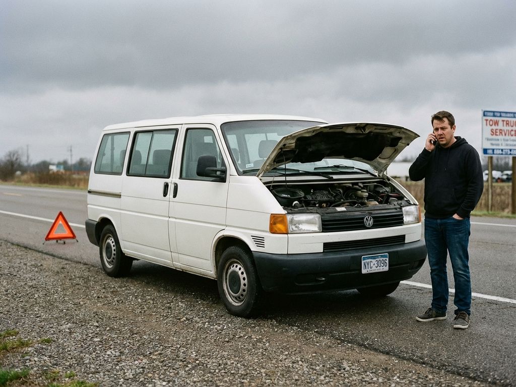 Witte Volkswagen busje met open motorkap langs de weg, bestuurder belt om pech hulp, waarschuwingsdriehoek geplaatst