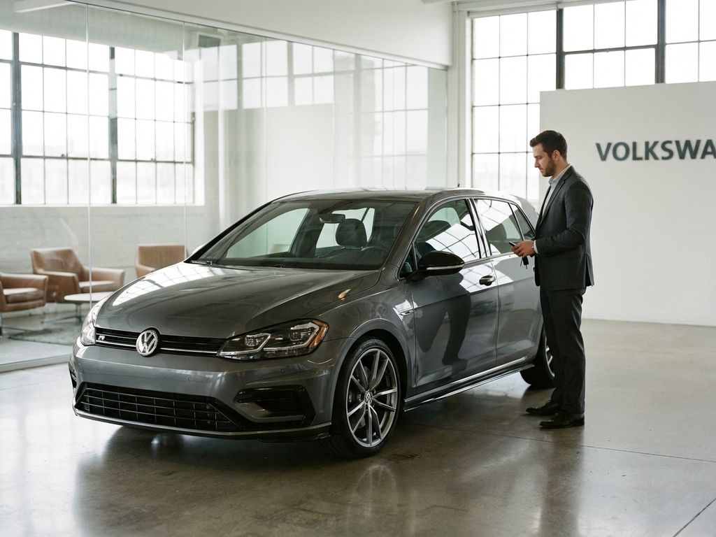 Volkswagen Golf in moderne showroom met zakenman in pak die autosleutels vasthoudt bij bestuurdersdeur