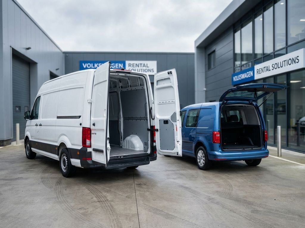 Witte Volkswagen Crafter en blauwe Caddy bestelwagens met open laadruimtes op verhuurterrein