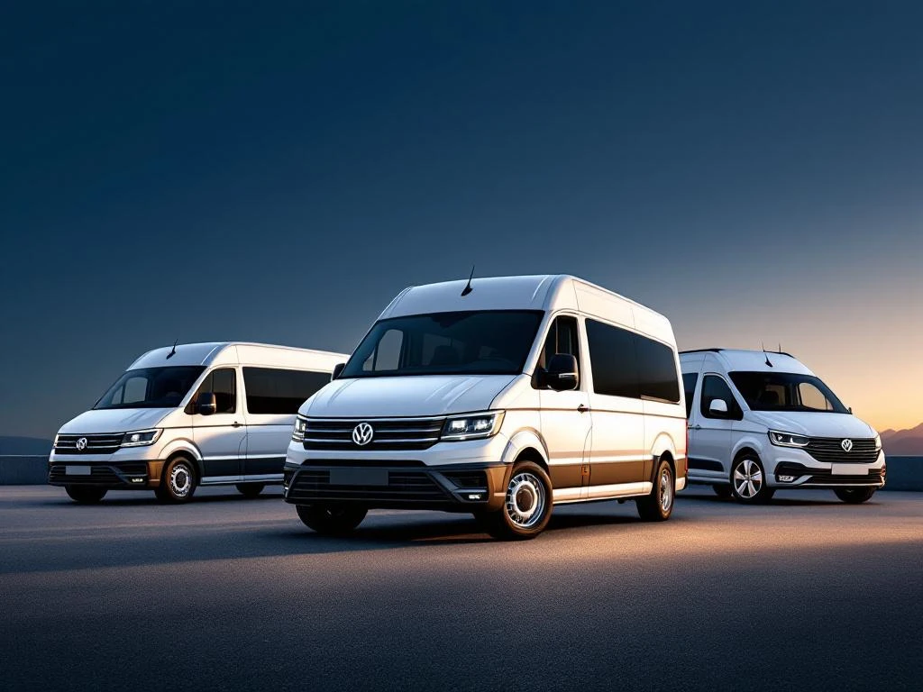 Witte Volkswagen 9-persoons bestelwagen met andere huurvoertuigen op asfalt tegen blauwe achtergrond