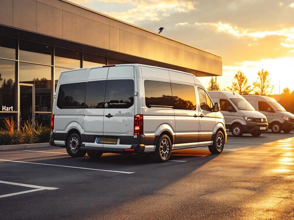 Witte Volkswagen 9-persoons bus geparkeerd bij Hart Autoverhuur tijdens gouden uur, met andere huurvoertuigen op achtergrond
